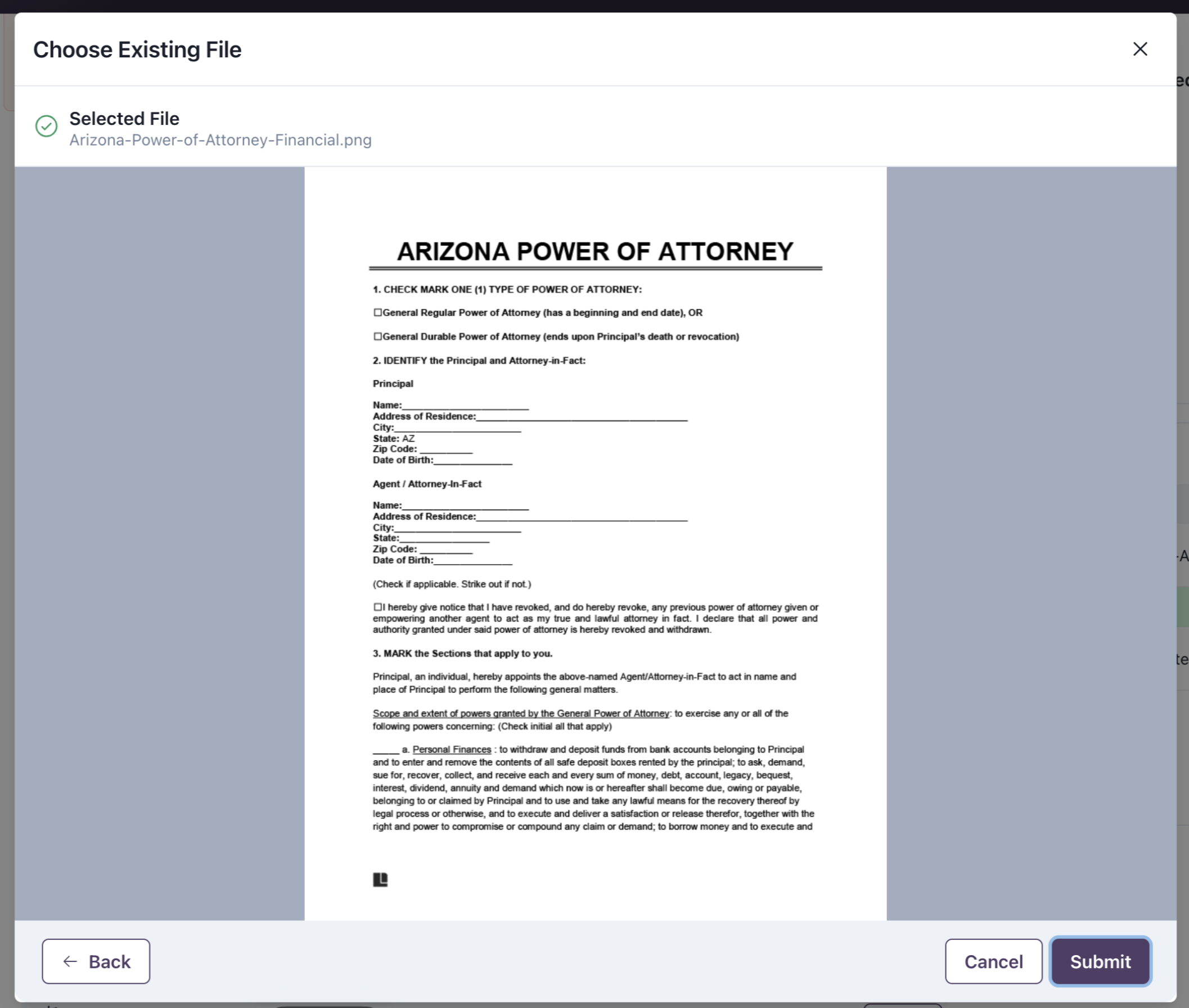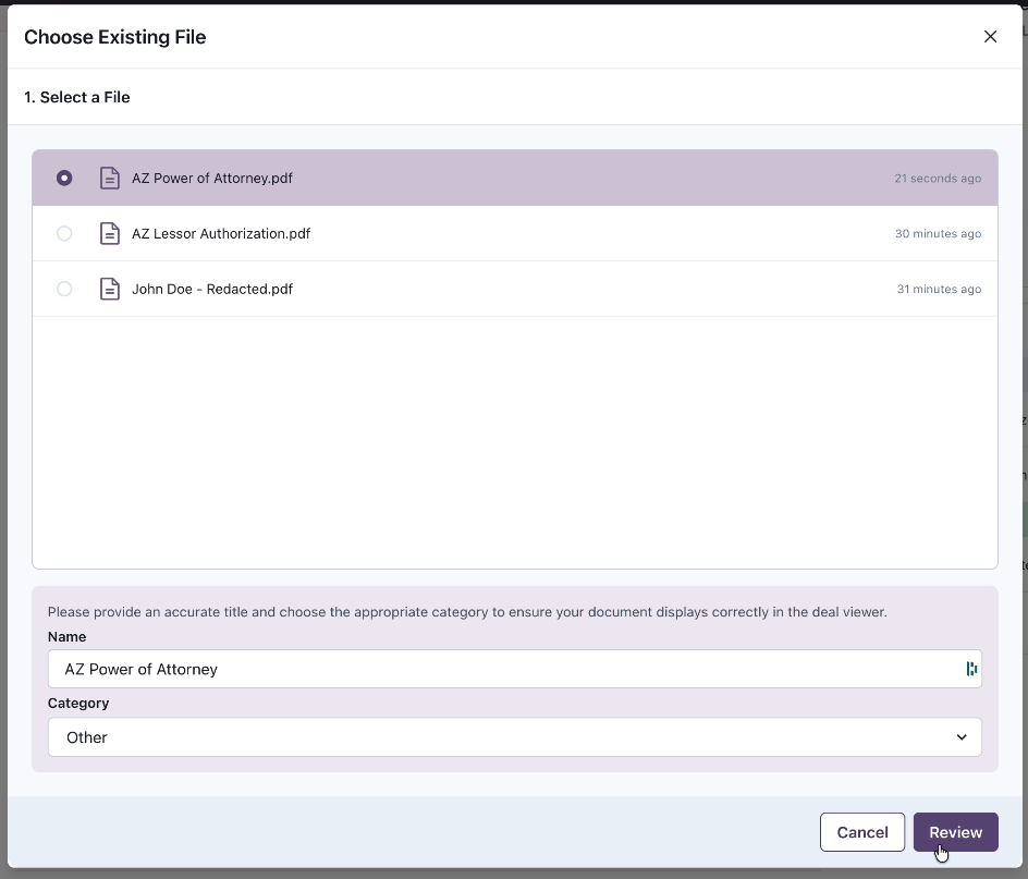 >Select the file you just uploaded. You can rename it and categorize it if you would like, then click 'Review'.
